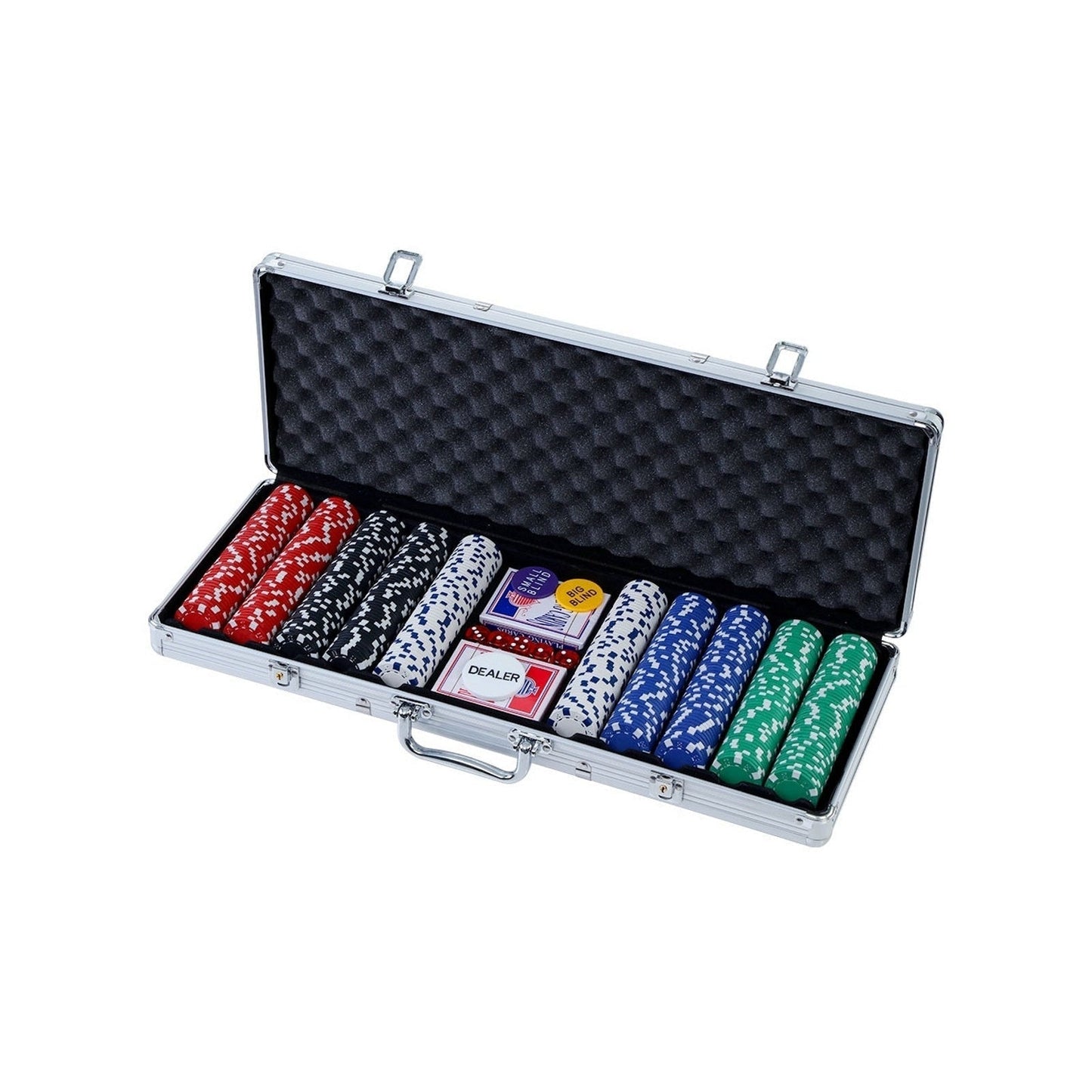 A sturdy aluminum travel case with 10 rows of 11.5gm poker chips in five styles (500 chips in all), with two decks of cards and dealer chip.