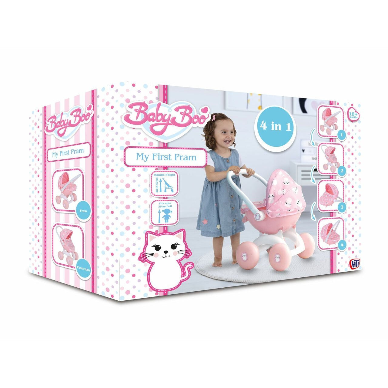 This 4 in 1 My First Pram is so versatile! This Baby Boo pram transforms from pram to pushchair. Detach the pram body to become a carrycot or push the handle back for the baby chair. The pram features a folding canopy to protect her head from too much sun. In addition, the pram is equipped with an apron. This pram come with an adjustable handle height 40-47cm. Furthermore, there is bedding provided to ensure your doll is comfy on her trips through the park. Decorated, in delicate pink and blue colourway. This pram provides a perfect fit for your doll, fits dolls up to 35cm. This is a lovely first pram that encourages nurturing, role-play and imagination, aiding in your child's social and cognitive development. Suitable for 18months and over.