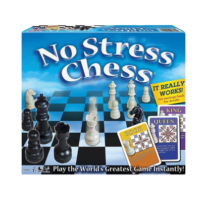 Play the worlds greatest game instantly Winning Moves Games is proud to present 'No Stress Chess', a game that will help you learn the world's greatest game - Chess. You can play instantly because the special game board guides you to set up your pieces and each card in the innovative deck shows you how to move the piece it pictures. You just set the pieces on the board, shuffle the deck, and begin to play! No Stress Chess teaches players the moves of all the Chess pieces. The game is played on a regulation Chess board, but doesn't require the movement knowledge or planning of Standard Chess. No Stress Chess can be played at several levels of difficulty, gradually introducing players to Standard Chess in incremental steps. When you're ready, just flip the board to its Standard Chess board side and play the authentic 'king of games'. Ages 7 + | Players: 2 | Playtime: 60 min