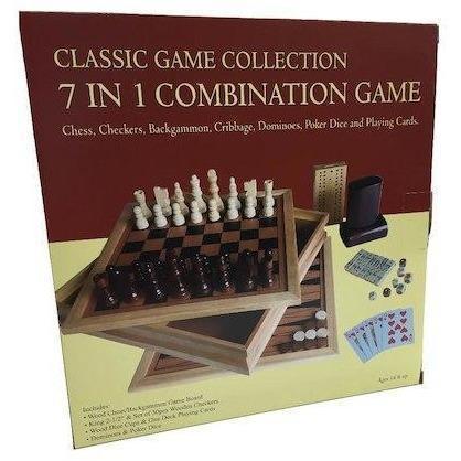 Contents Include: Wood Chess/Backgammon Game Board, Chess Pieces with 2.5-inch King, 30 Wooden Checkers, Wood Dice Cups, Deck of Playing Cards, Dominoes, Poker Dice, Cribbage Board and Pegs, Instructions