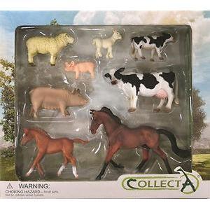 Farm boxed set contains. 1 Sheep, 1 Lamb, 1 Cow, 1 Calf, 1 Horse, 1 Foal, 1 Sow and 1 Piglet