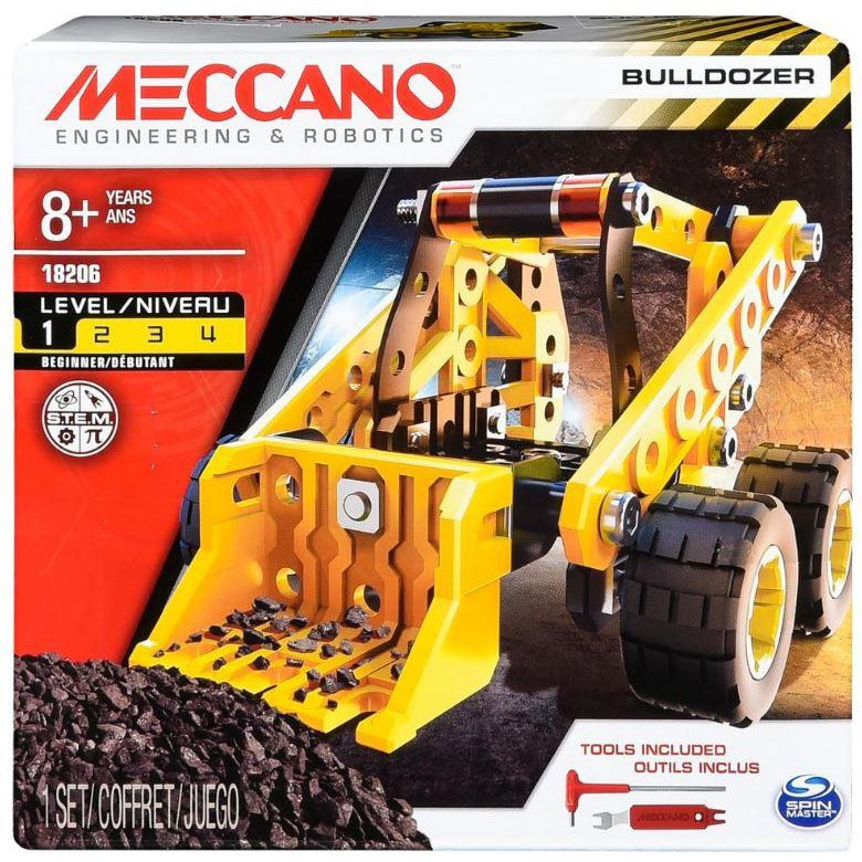 Enter the exciting world of construction with Meccano! For years, Meccano has introduced curious minds to the thrill of the build! Now, this accessible new set gives young builders the tools and parts needed to assemble a moving Bulldozer! Your child will feel just like an engineer as they work with real metal parts. Set at a beginner level, with easy-to-understand instructions, this kit is a great way to introduce kids to S.T.E.A.M. building kits. As they have fun building, they will use concepts from the areas of science, technology, engineering, art, and math to construct their Bulldozer. When complete, the fun continues as builders use the working wheels, moving front loader and rear scoop for imaginative play! Fun and learning come together in this exciting model Bulldozer building kit from Meccano!