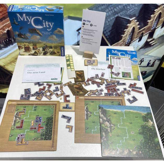 My City is a competitive legacy game where you develop a city on your own playing board through the ages.