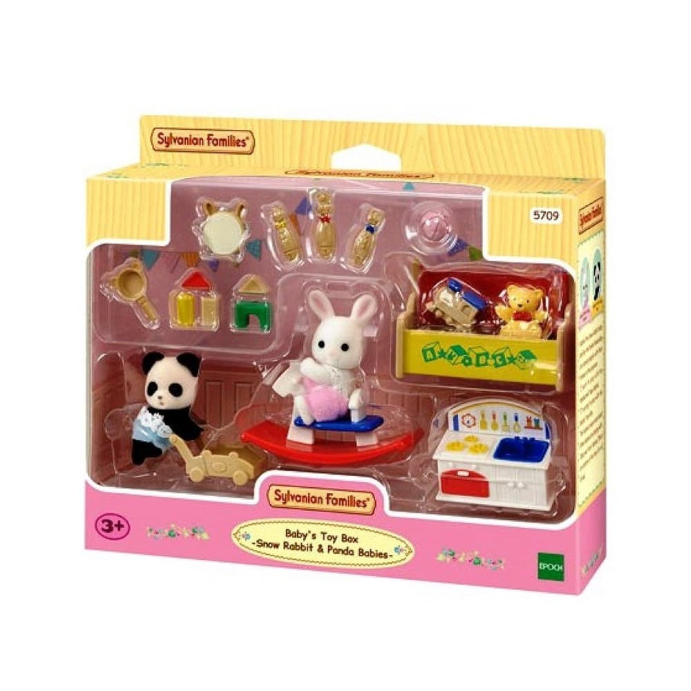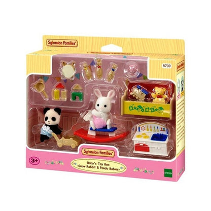 Sylvanian Families 5709 - Baby's Toy Box set has everything baby Snow Rabbit and baby Panda need for their play date. It comes with the two figures, a toy box, play kitchen, rocking horse, and other accessories. Children can enjoy hours of creative, imaginative play as they explore all the possibilities this set offers.