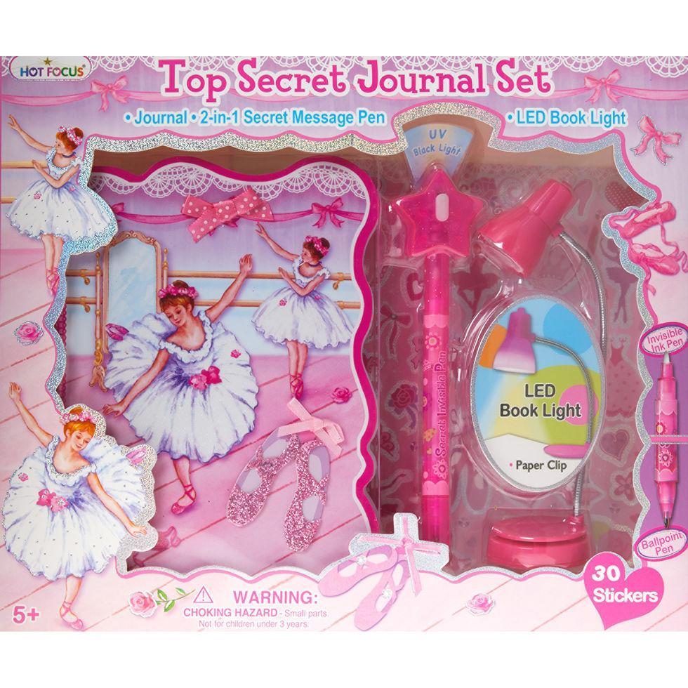 his journal set is available in pink and features a ballerina theme design. It includes a journal, invisible writing pen with a black light, a sheet of stickers and an LED book light.