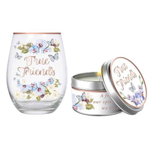 True Friend set includes Vanilla scented candle in a tin with matching stemless wine glass.