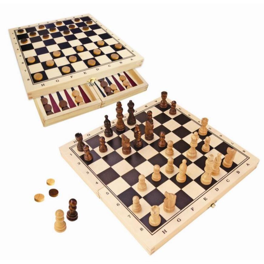 Have triple the fun with this wooden set of chess, checkers and backgammon.